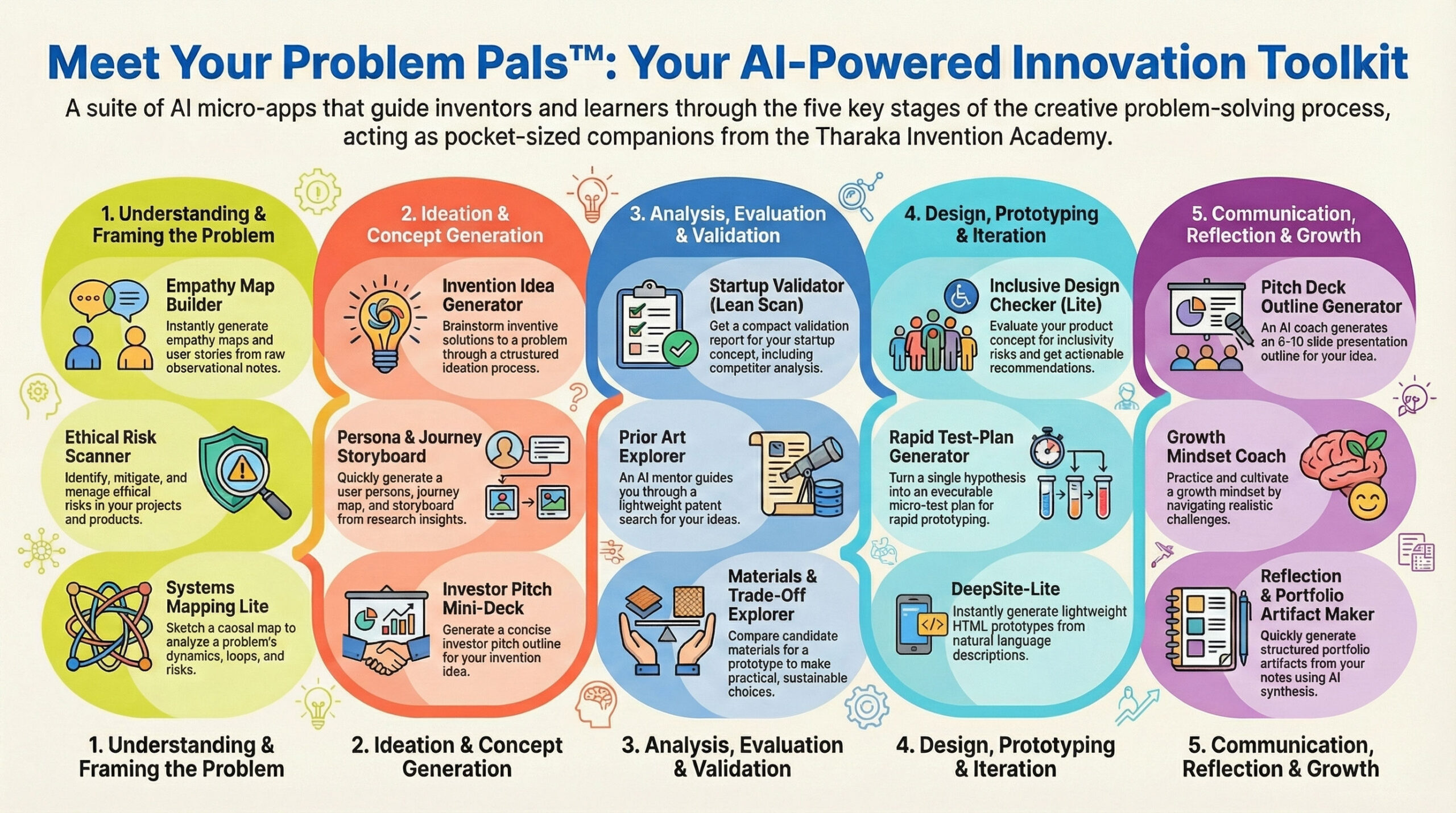 Problem Pals™ Index, a comprehensive collection of AI-powered micro-apps created by the Tharaka Invention Academy to support the creative process. These digital companions are organized into five distinct phases, ranging from initial problem framing and ideation to advanced analysis and design iteration. Each tool is designed to extend human intelligence by helping users generate concepts, evaluate ethical risks, and plan prototypes within a structured learning ecosystem. The suite emphasizes practical application and cultural relevance, offering specialized support for market research, intellectual property guidance, and team collaboration. Ultimately, these “smart companions” empower inventors to navigate complex professional workflows through a series of lightweight, accessible, and interactive AI modules.